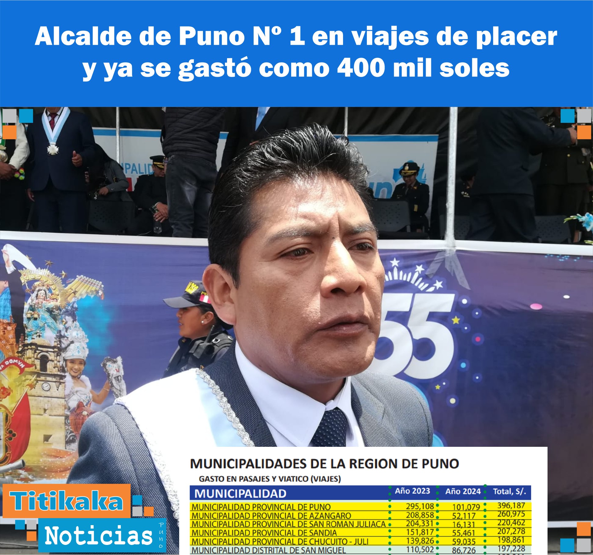 En tanto, el burgomaestre sanromino, Oscar Acaeceres gastó 204 mil 331 soles en su primer año, y en lo que corre del 2024 recapacitó y solo gastó S/ 16 mil 101. Éste consiguió el financiamiento de S/ 700 millones para la megaobra de agua potable para Juliaca.